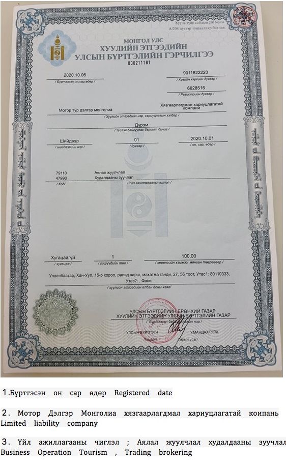 Urkunde über die ordentliche Meldung der Firma in der Mongolei.